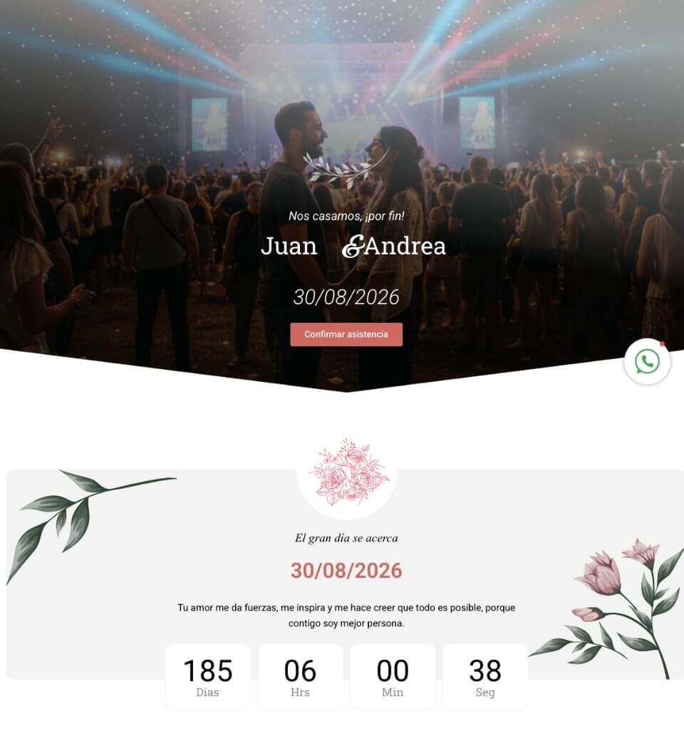 Crea tu propia página web de boda personalizada para compartir con tus invitados toda la información de tu gran día. Fácil de editar, elegante y lista para enviar en minutos.